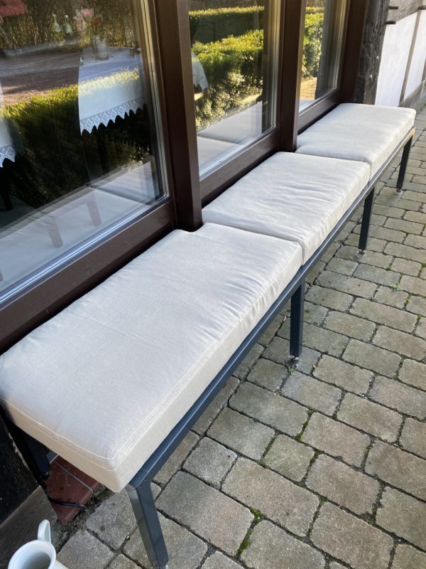 Gleichzeitig bietet die Konstruktion viele Möglichkeiten der Individualisierung: Die Bank kann ohne Polster für eine klare, industrielle Optik genutzt werden oder mit passenden Sitzkissen, um den Komfort zu erhöhen. Die Polster lassen sich saisonal oder farblich austauschen, wodurch die Bank sich jederzeit an die Umgebung anpassen lässt. Auch Länge, Farbe und Gestaltung der Bank können flexibel gewählt werden – perfekt für maßgeschneiderte Projekte in jedem Außenbereich.