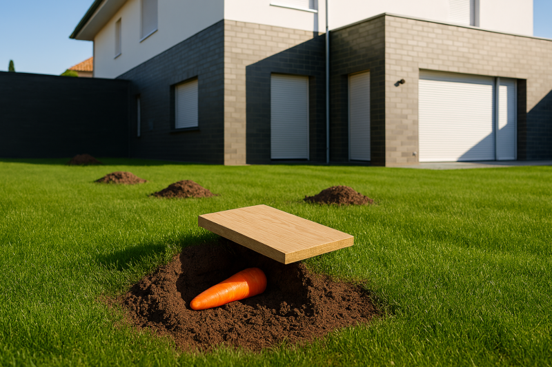 3. Leicht abdecken: Öffnung mit lockerem Erdreich oder einem Brettchen abdecken, damit keine Helligkeit eindringt (Wühlmäuse meiden Licht).