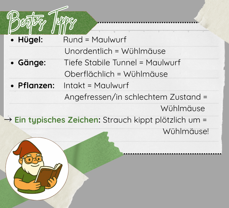 Die typischen Merkmale an Hügeln, Gängen und Pflanzen geben dir klare Hinweise darauf, wer in deinem Garten unterwegs ist. Und mit den einfachen Tests kannst du im Zweifel schnell Gewissheit bekommen.
